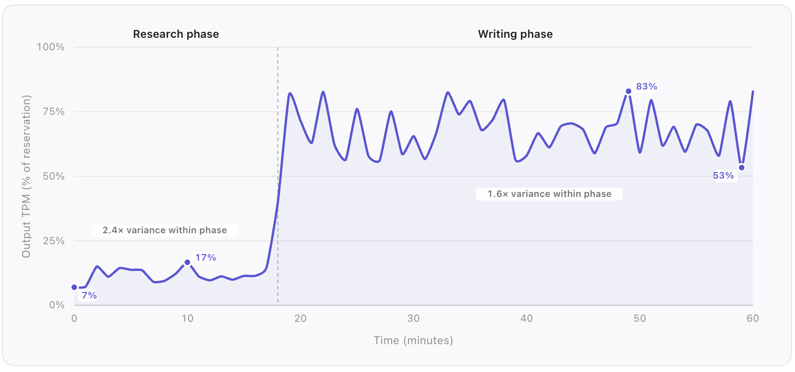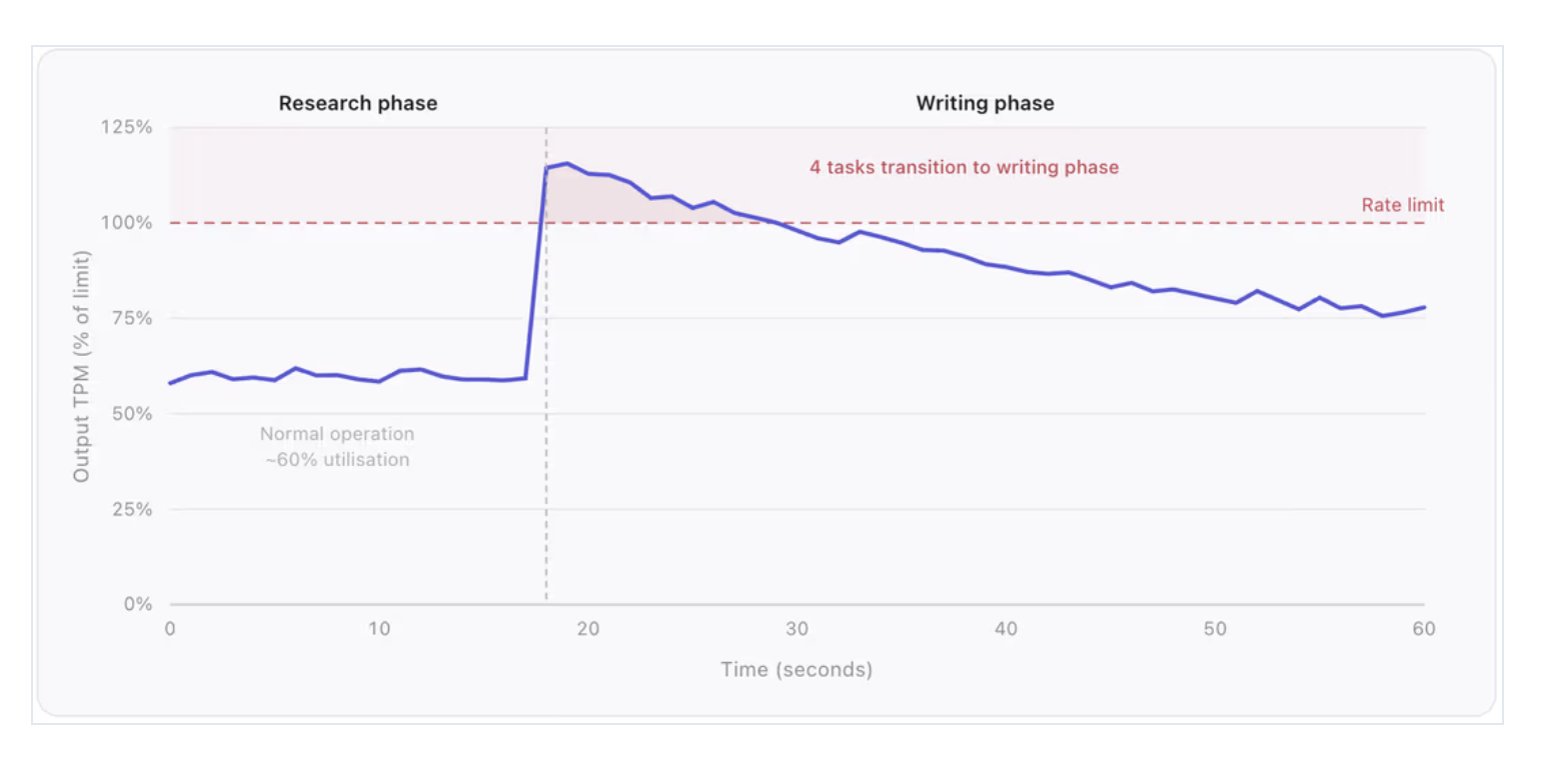 - Concurrent bursts amplify problems: Tasks that start around the same time increasingly consume more tokens around the same time. Our API supports batch requests where users submit many research tasks at once, meaning dozens of tasks kick off simultaneously and tend to hit the same phases at the same time. When several tasks transition from research to writing phase simultaneously, the demand profile shifts across multiple tasks within seconds. Each individual reservation fits within limits in isolation, but collectively causes them to exceed the limit.