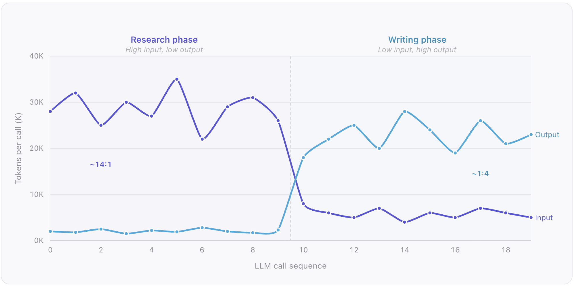 - The token profile flips between phases: Each deep research task passes through distinct phases with completely different token profiles. The research phase of a deep research task fans out into multiple parallel calls which searches and summarises the results, each consuming high input tokens but producing few output tokens. The writing phase of a deep research task inverts that, synthesising everything into a long form report in a single call that consumes less input tokens but produces much more output tokens. The ratio between input and output tokens can flip by an order of magnitude between phases, while both drawing from the same provider limits.