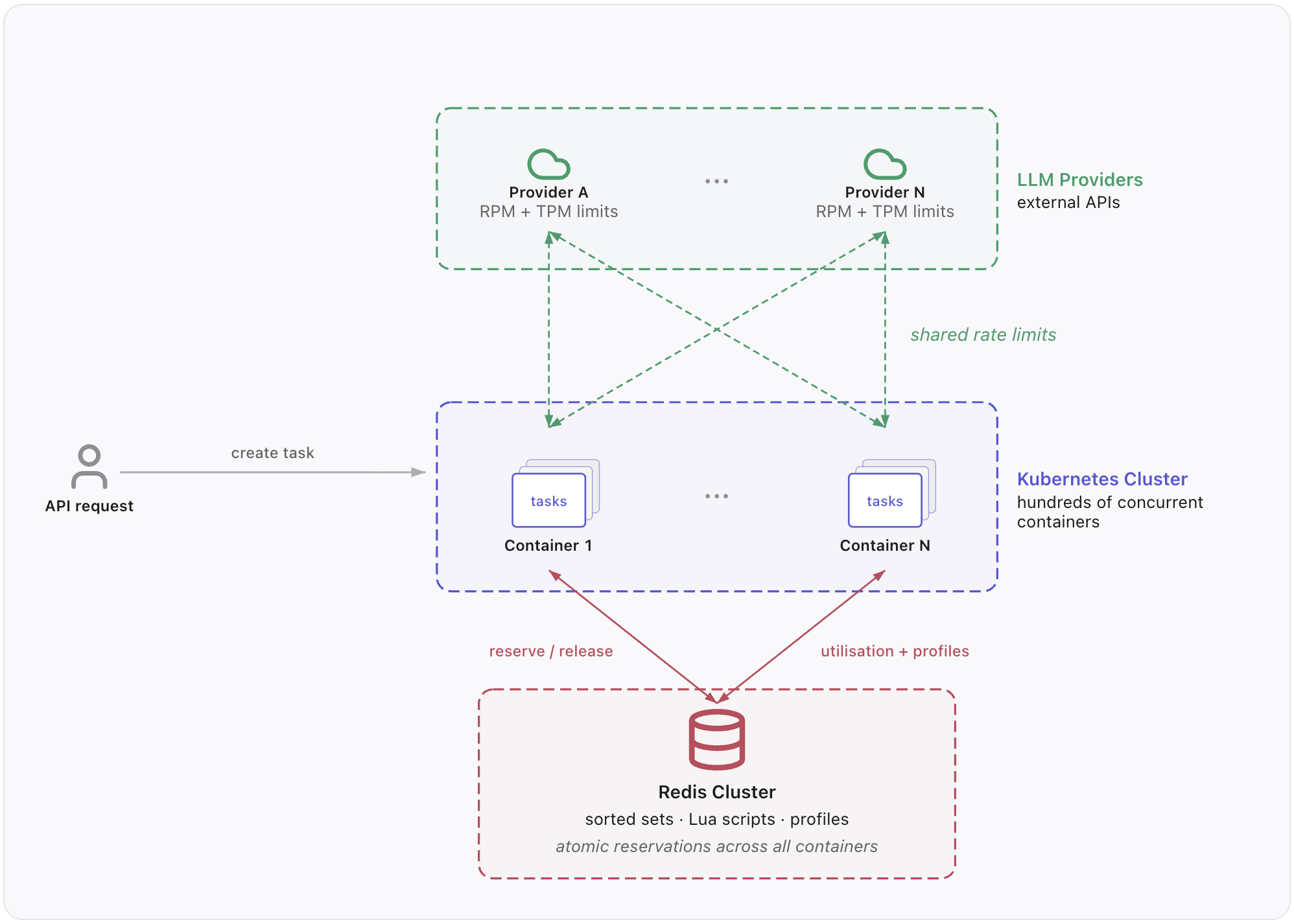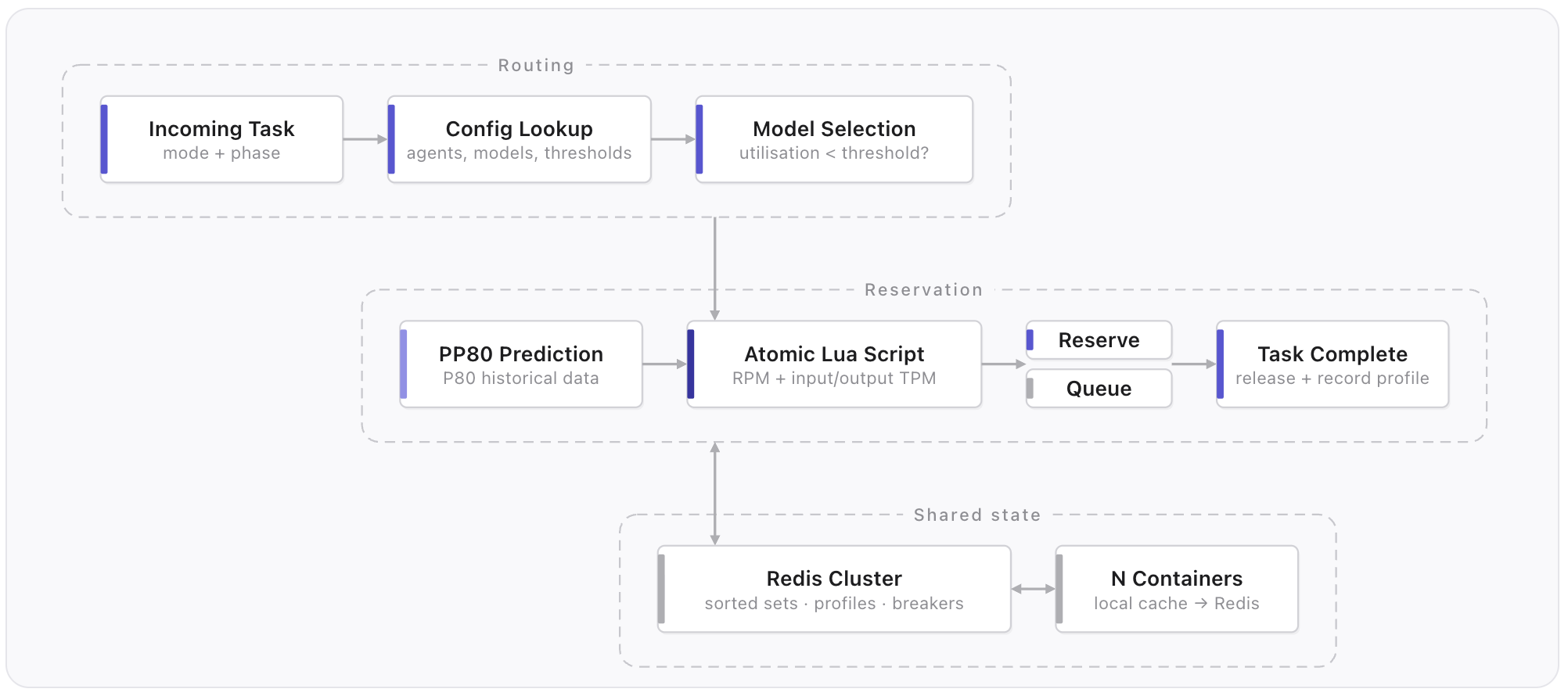 Hundreds of containers run concurrently, each processing multiple tasks, requiring every container to have a synchronised view of cluster wide capacity usage. A redis cluster coordinates this, with each model from each provider having three sorted sets: tracking RPM (requests per minute), input TPM, and output TPM. Every container reads from and writes to these same sets, without the overhead of direct container-to-container coordination.