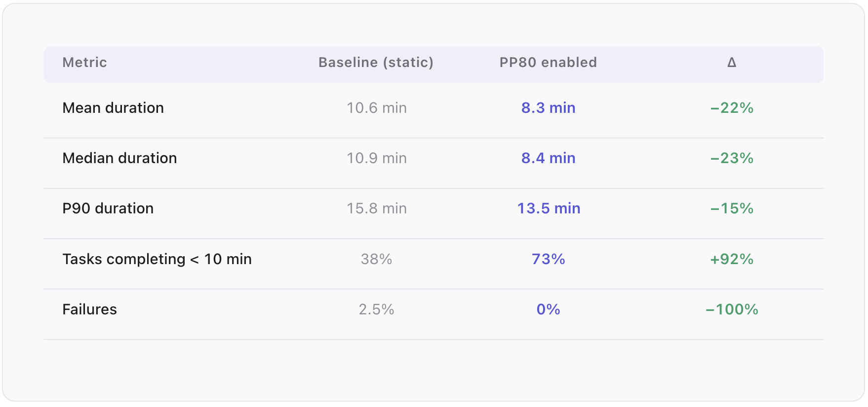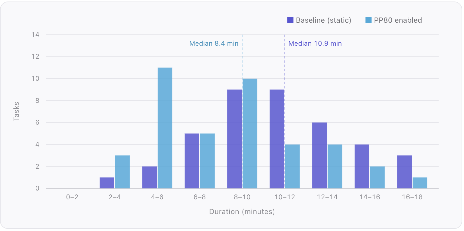 The queue processor admitted tasks immediately when capacity was available and held the rest until slots freed up, draining the full queue in under 11 minutes. Zero rate limit failures across all providers. With static estimates, provider rate limits supported a maximum of 57 concurrent deep research tasks before queuing kicked in. PP80’s smaller per-task reservations raise that ceiling to approximately 71 concurrent tasks, a 25% increase, without any changes to provider rate limits.