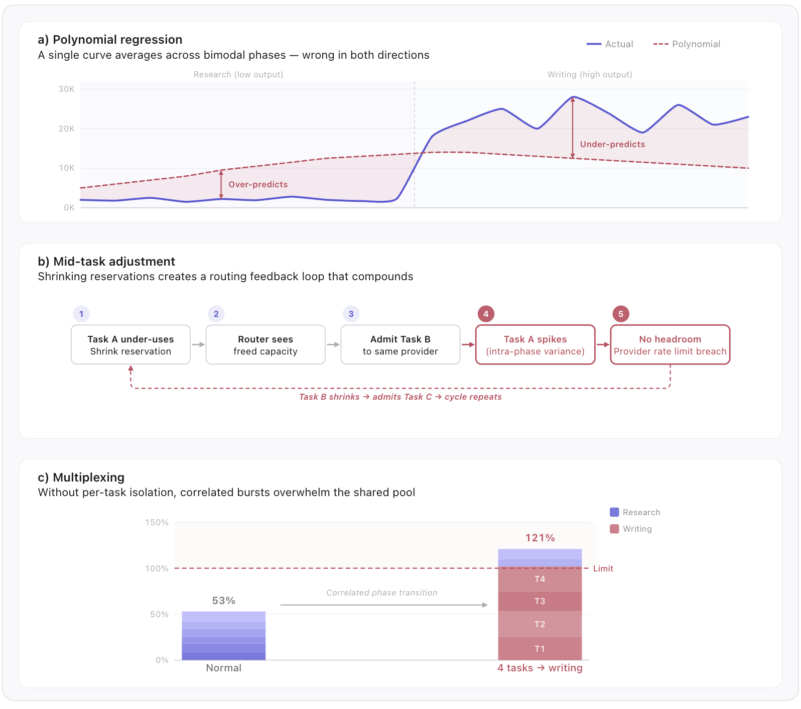 - Mid-task adjustment revealed how tightly coupled routing decisions are to reservation sizes. When a task uses less than its reservation, the system shrinks the reservation to free capacity, which the router sees and immediately admits a new task, increasing load on the same provider. Now the provider carries more total load. As seen with polynomial regression, token consumption fluctuates significantly within a phase, so the original task’s call may spike above its reduced reservation. But that headroom is now held by the newly admitted task. The original task either breaches the provider's rate limit, causing failures that propagate to every task on that provider for the remainder of the rate window, or it queues waiting for capacity that won't free up until the new task finishes. Now as the other tasks get shrunk, the system recursively admits more tasks until there is no headroom left for any task to absorb a burst. (Figure 6b)